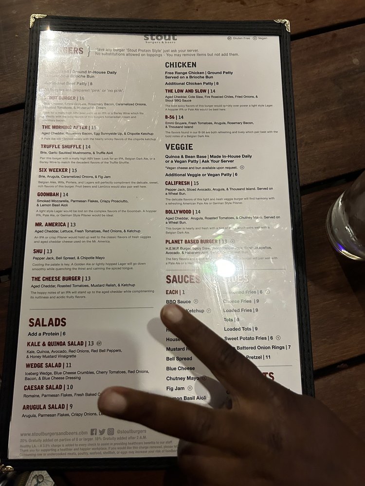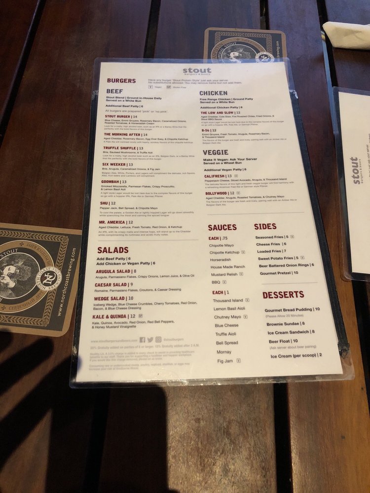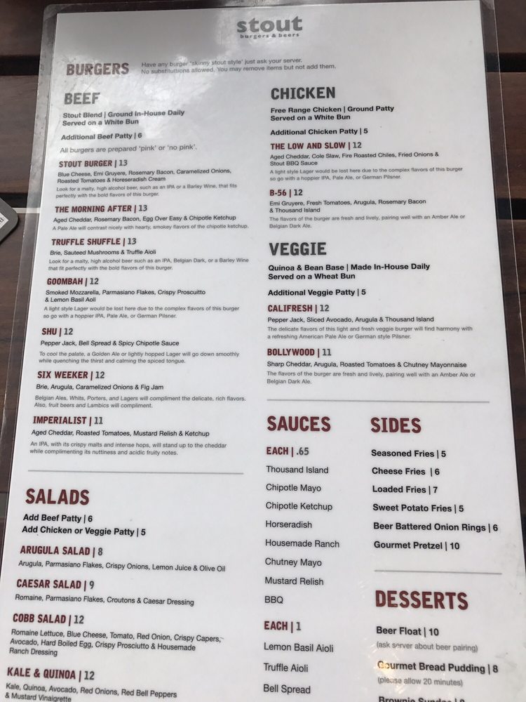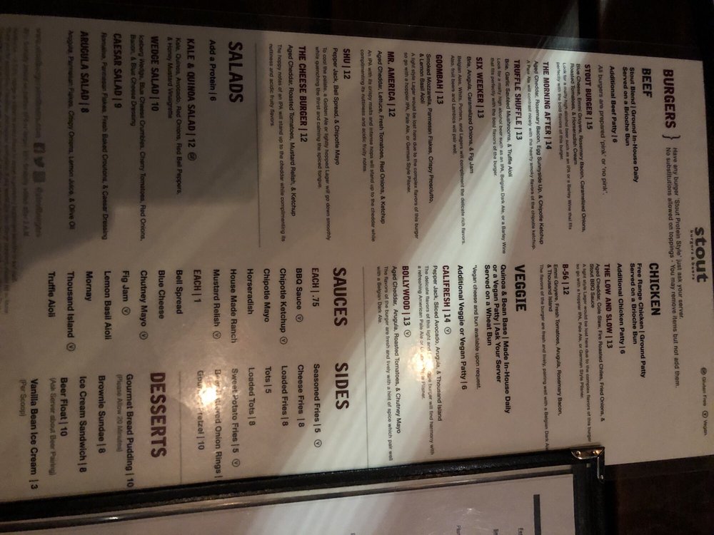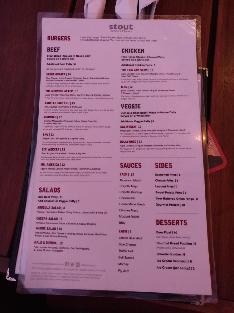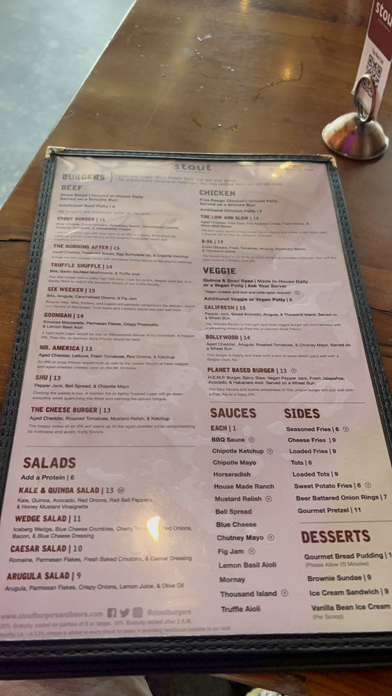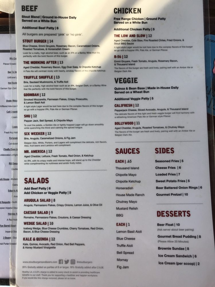 Stout Burgers & Beers, located in Los Angeles, offers a diverse menu of delicious burgers, salads, and chicken options. The standout items include the unique and flavorful Stout Burger Blue Cheese, the indulgent Morning After with a sunny-side-up egg, and the aromatic Truffle Shuffle with truffle aioli. Customers praise the restaurant for its friendly staff, trendy atmosphere, and the mouthwatering loaded fries. While some critics noted inconsistencies in burger preparation, overall, Stout Burgers & Beers is a must-visit for burger enthusiasts seeking quality ingredients and creative flavor combinations. Whether you're looking for a quick bite or a leisurely meal, this gastropub promises a satisfying dining experience with its beer selection and hearty food options.